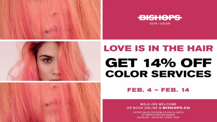 - A Fresh New Hair Color: Give the gift of a bold transformation with a Bishops gift card (purchase in store). New clients can enjoy 14% off color services through February 14th—what better way to celebrate than with a new look?