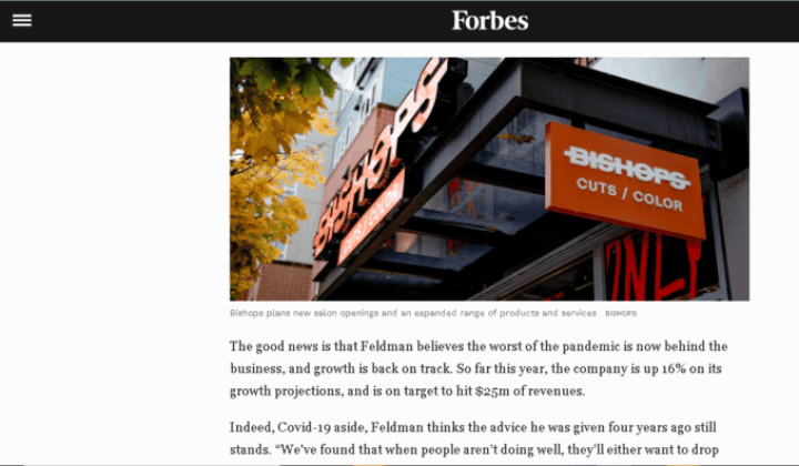 You heard it right! Bishops and @forbes sat down for an interview. (Well it was on the phone but, you know what we mean). Our CEO, Leigh Feldman, chatted about COVID closures, recessions, and how damn proud Bishops is...