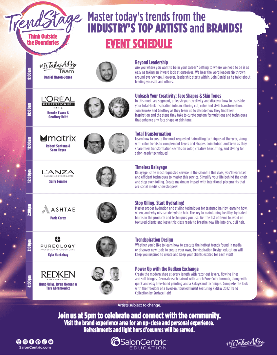 Come learn about becoming a leader in the hair business, balayage, hydration, coloring and face shapes, trending styles and cuts, styling, razor cuts and SO MUCH MORE.
