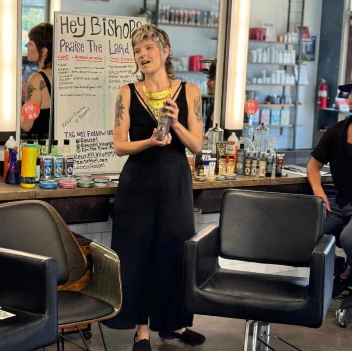 As a certified Scumbassador for Reuzel, Em brought a unique perspective grounded in traditional barbering but enhanced by modern techniques. Her approach focuses on precision, artistry, and using high-quality products, making her an invaluable teacher for stylists looking to refine their skills. In this class, she demonstrated advanced cutting and styling methods, from classic fades and pompadours to texturizing techniques, showing the team how to achieve looks that stand out while still providing the personalized touch Bishops clients love.