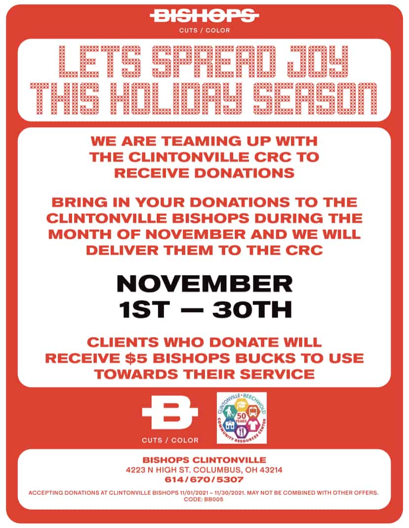 Your donations help families in the Columbus community, and for every donation Bishops Clintonville will provide $5 off hair services during the month of November for any long cut, short cut, buzz cut, trim, hair color, hair style, blow out, skin fade or more!