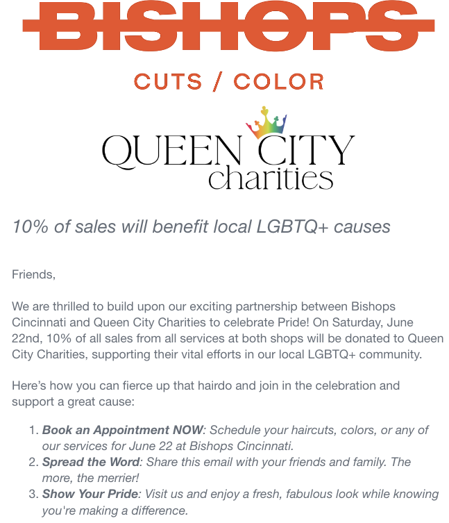 In addition to their participation in the drag brunch, Bishops Clifton Heights and Bishops Oakley are organizing a special fundraiser on June 22nd. During this event, 10% of all service sales from the 2 shops will be donated to Queen City Charities, further extending their support for local initiatives. This fundraiser not only highlights Bishops ongoing philanthropic efforts but also encourages community members to contribute to a worthy cause while enjoying the high-quality services offered by these shops.