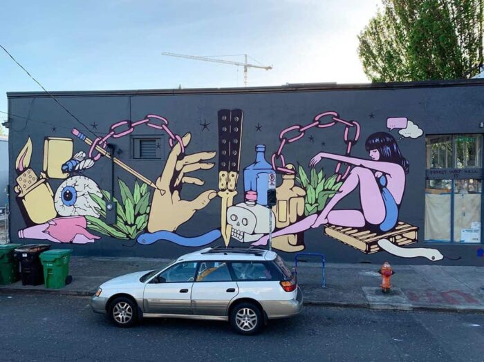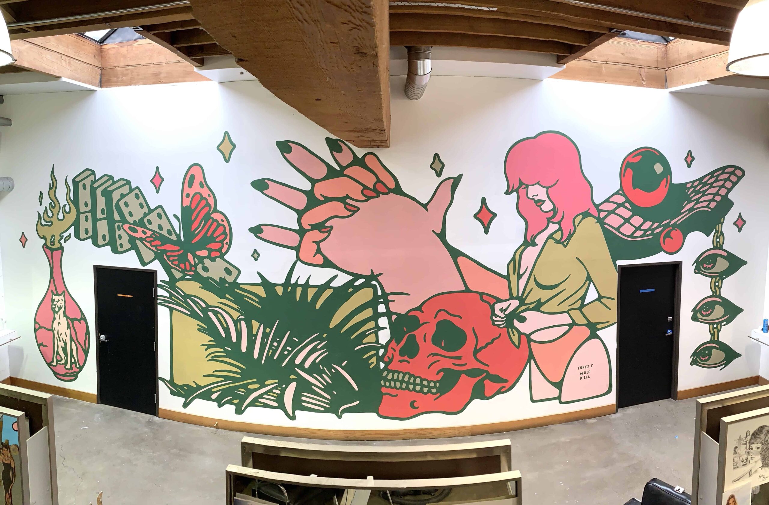 With the extended closure of almost 100 days, several Bishops Portland shops took the opportunity to refresh and remodel their locations. Bishops commissioned Forest Wolf Kell, a muralist, illustrator and designer based in Portland to refresh murals at the Pearl District (pictured above), NW 21st (mural pictured below), and NE 28th locations. Kell’s large-scale work can be seen up and down the west coast and parts of the midwest. His illustrations and murals typically consist of collections of objects, symbols and people constructed into thought provoking compositions.