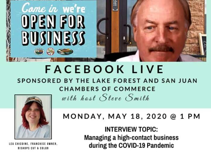The Lake Forest Chamber of Commerce held their weekly Facebook Live session “Open for Business”. The show delves into successes and challenges faced by businesses in their section of Orange County especially in the wake of a pandemic. Hosted by Steve Smith, this week’s topic was “Local Hair Salon Opening Strategy”. Lea Chicoine, owner of Bishops Lake Forest and East Irvine, was the guest for the May 18th show. She revealed the enhanced precautions her shops will be taking once area salons and barbershops are allowed to reopen. A few of the many measures include new vinyl dividers between stations, removing the waiting room and for clients, the pleasant surprise of free shampoos now included with all hair services. The shops have also entered into a partnership with local beer stalwarts Left Coast Brewing. The brewery pivoted to manufacturing hand sanitizer once the pandemic arrived and will be providing both Bishop locations with trial sized sanitizers to be given to all clients. Watch the entire clip below.