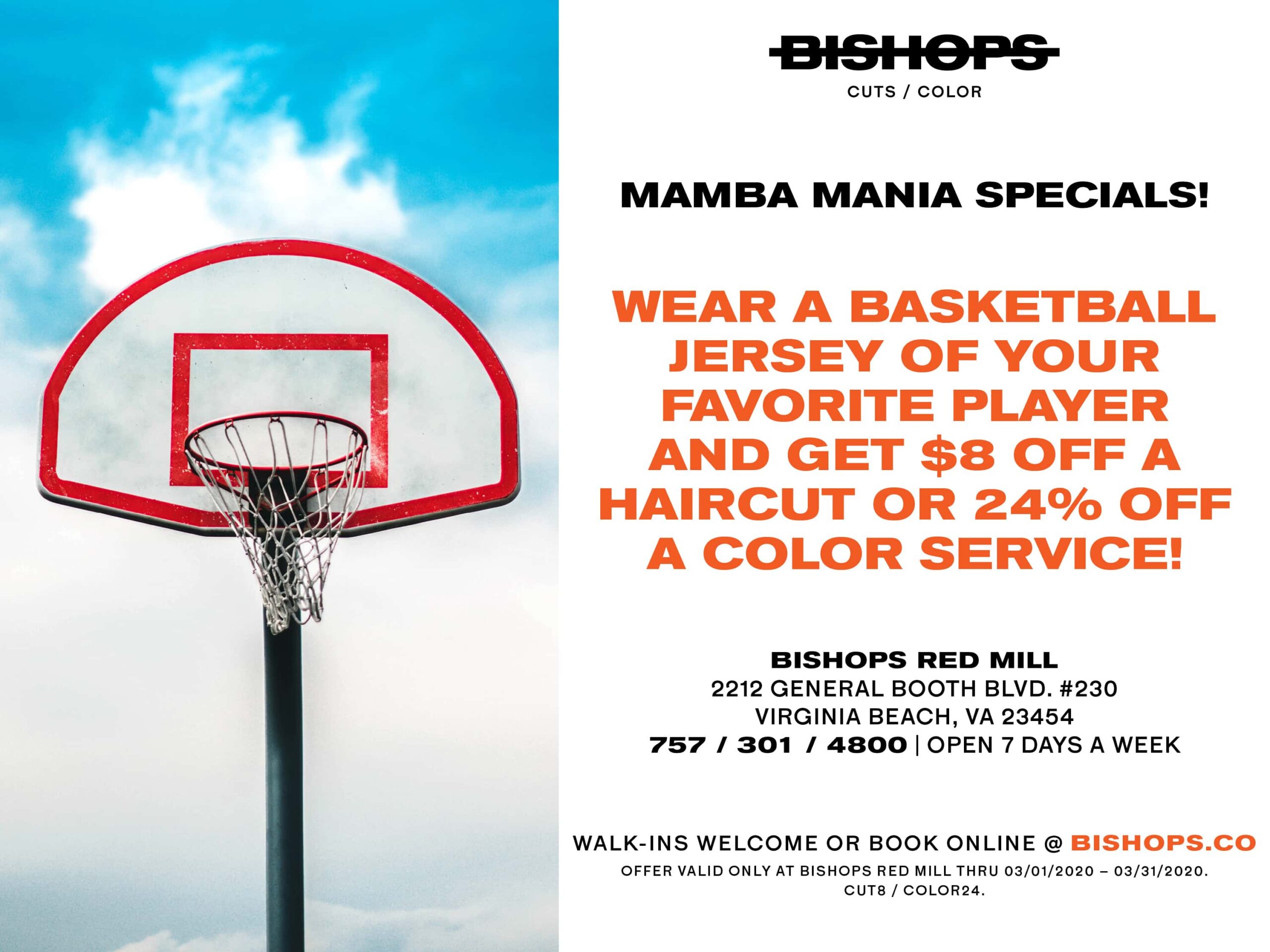One of the hallmarks of March is of course NCAA basketball’s March Madness. This year brings a tinge of sadness with the passing of the basketball world’s own Kobe Bryant. Bishops Red Mill will be celebrating his memory by offering discounts off services throughout the month based on his two associated NBA jersey numbers of #8 and #24. Wear a basketball jersey of your favorite player (our headquarters favorite is Damian Lillard, we are based out of Oregon after all) and receive $8 off a haircut or 24% off a color service. Kobe himself had a variety of hairstyles in his career ranging from short afro styles (afro Kobe) to the bald fade cuts he rocked during his black mamba period. Folks can book ahead or walk-in 7 days a week at the shop: 2212 General Booth Blvd Suite 230 Virginia Beach, VA 23454
