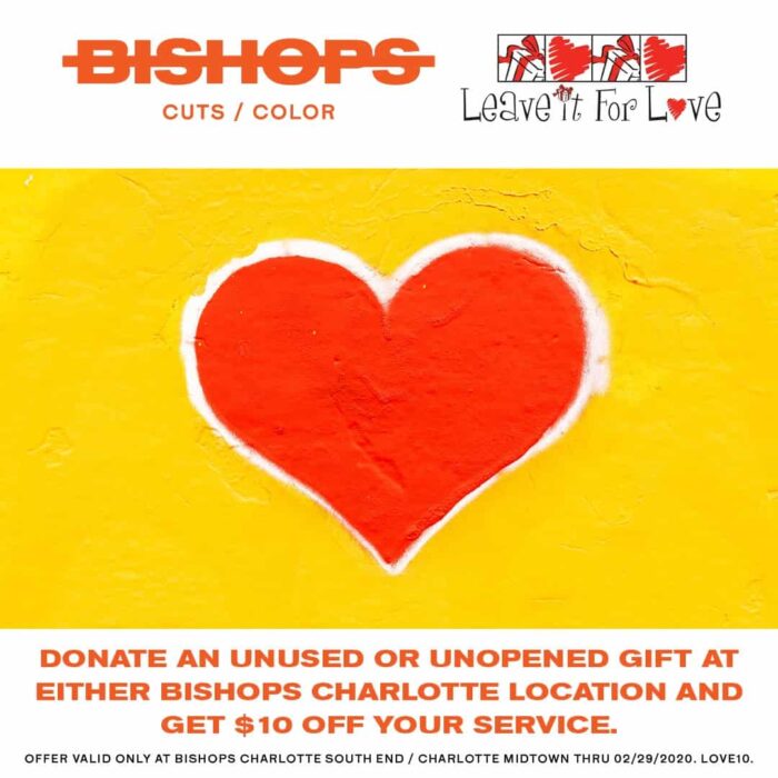 Through February 29th, Bishops Charlotte will be collecting donations for theĀ Leave it for Love campaign (An innovative recycling program started by Jennifer Molski in Chicago). This program allows you to donate your new and unused, unopened, and unwanted new items to less fortunate adults in Charlotte. Donations will be accepted at both locations with the shops matching the donation with a $10 off service coupon towards your hair service.