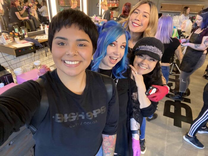 Bishops was delighted to welcome back renowned Pulp Riot color educator Kaseyoh (also known as Kasey Ohara Skrobe). Bishops San Jose Downtown hosted the color class January 13th with other area Bishops: Campbell, Cupertino, Sunnyvale, Santa Clara and Pleasanton also joining in the fun “Look & Learn” training session. Kasey’s specialty is of course Rainbow hair which she also covered in her last classes at the Bishops Education center.