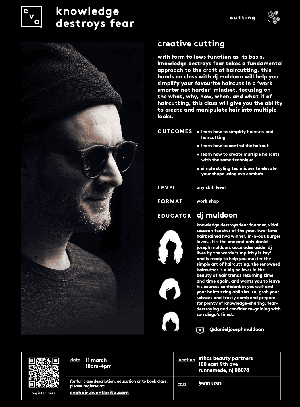 knowledge destroys fear founder, vidal sassoon teacher of the year, two-time hairbrained hva winner, in-n-out burger lover… it’s the one and only daniel joseph muldoon. accolades aside, dj lives by the words ‘simplicity is key’ and is ready to help you master the simple art of haircutting. the renowned haircutter is a big believer in the beauty of hair trends returning time and time again, and wants you to leave his courses confident in yourself and your haircutting abilities. so, grab your scissors and trusty comb and prepare for plenty of knowledge sharing, fear-destroying and confidence gaining with San Diego’s finest.