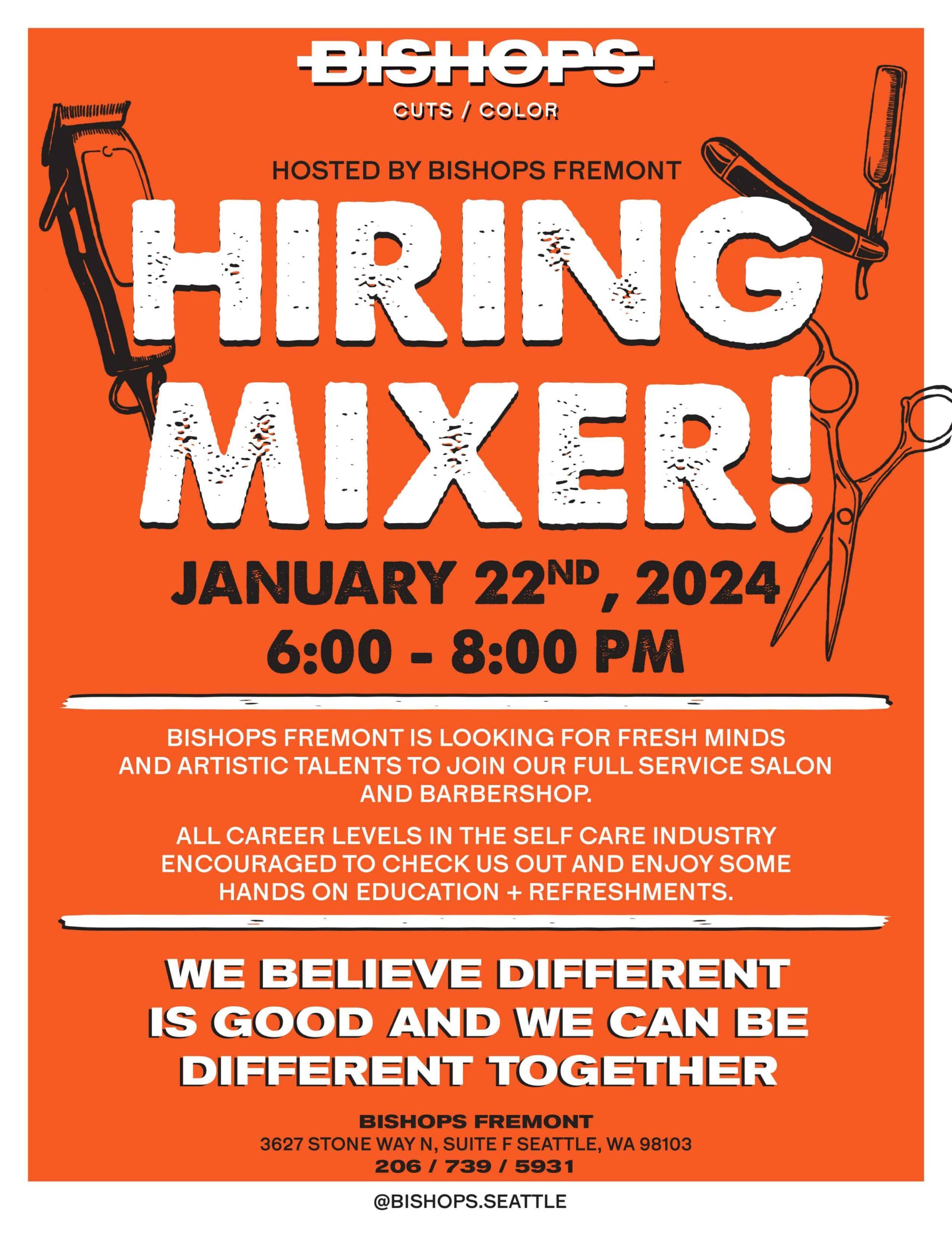 Join us on January 22, 2024, at Bishops Fremont as the shop opens its doors for an employment mixer. This hiring event is open to any Seattle area hairstylists, barbers, and colorists interested in exploring what Bishops offers as an established and growing hair company and brand with 40+ locations in 13 states.