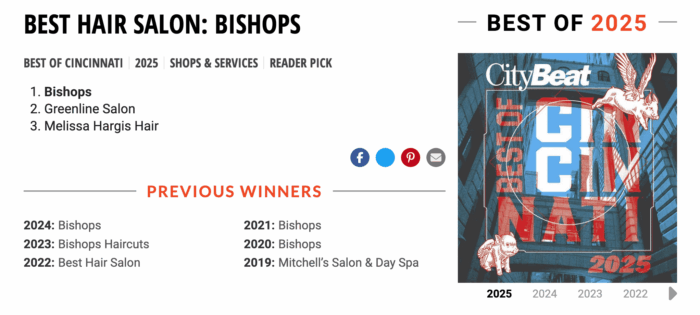The results are in, and we’re proud to share that Bishops Oakley and Bishops Clifton Heights have once again been voted Best Hair Salon in the 2025 Best of Cincinnati CityBeat Readers Poll! We also landed 2nd place in the Best Barbershop category, continuing a tradition of excellence and recognition that sets us apart in the Cincinnati hair scene.