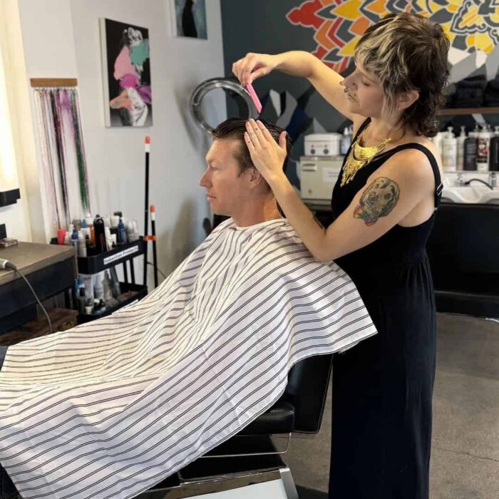 Reuzel “Scumbassador” Em from Em’s Classic Barbershop recently visited Bishops Lowry to deliver an exclusive class on advanced barbering skills. Known for her expertise and dedication to classic barbering, Em shared her wealth of knowledge and passion for the craft, providing Bishops stylists with hands-on techniques and professional insights that elevate the barbershop experience.