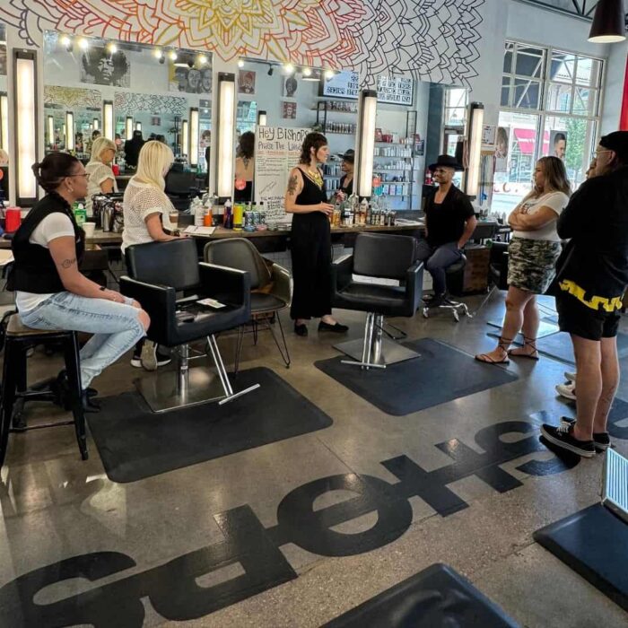 As a certified Scumbassador for Reuzel, Em brought a unique perspective grounded in traditional barbering but enhanced by modern techniques. Her approach focuses on precision, artistry, and using high-quality products, making her an invaluable teacher for stylists looking to refine their skills. In this class, she demonstrated advanced cutting and styling methods, from classic fades and pompadours to texturizing techniques, showing the team how to achieve looks that stand out while still providing the personalized touch Bishops clients love.