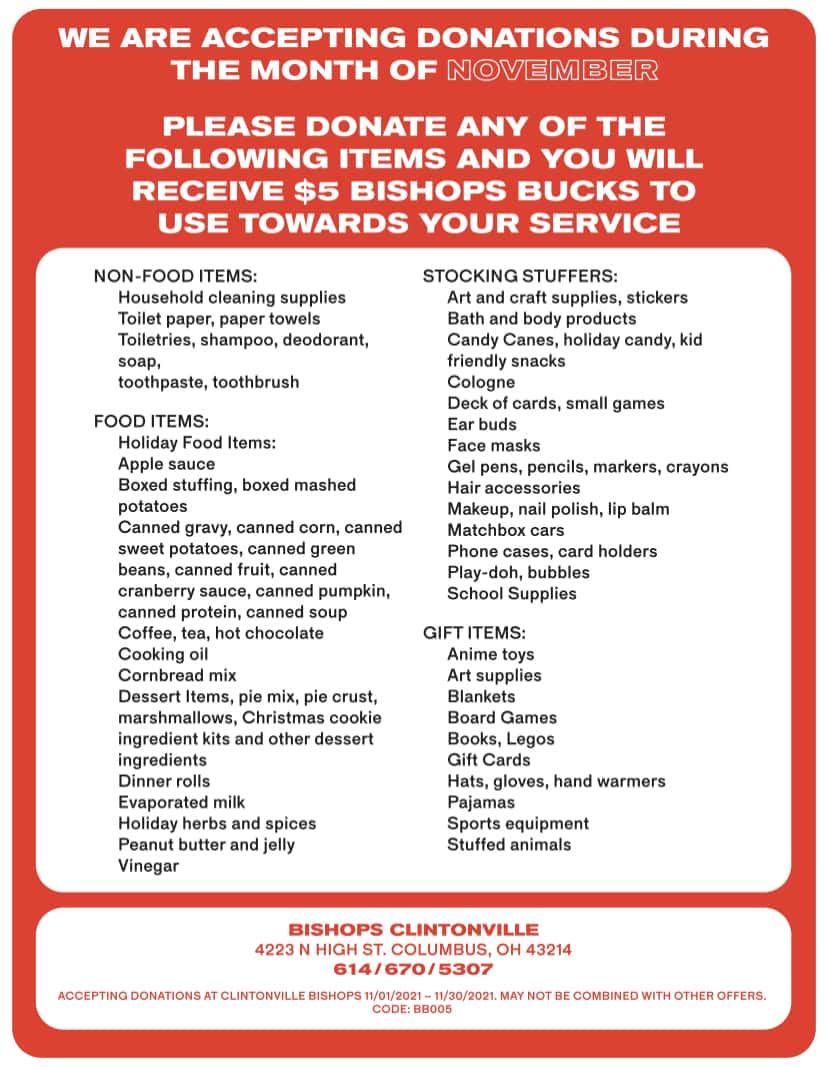 Your donations help families in the Columbus community, and for every donation Bishops Clintonville will provide $5 off hair services during the month of November for any long cut, short cut, buzz cut, trim, hair color, hair style, blow out, skin fade or more!