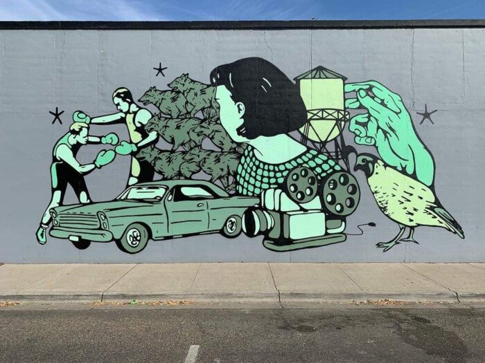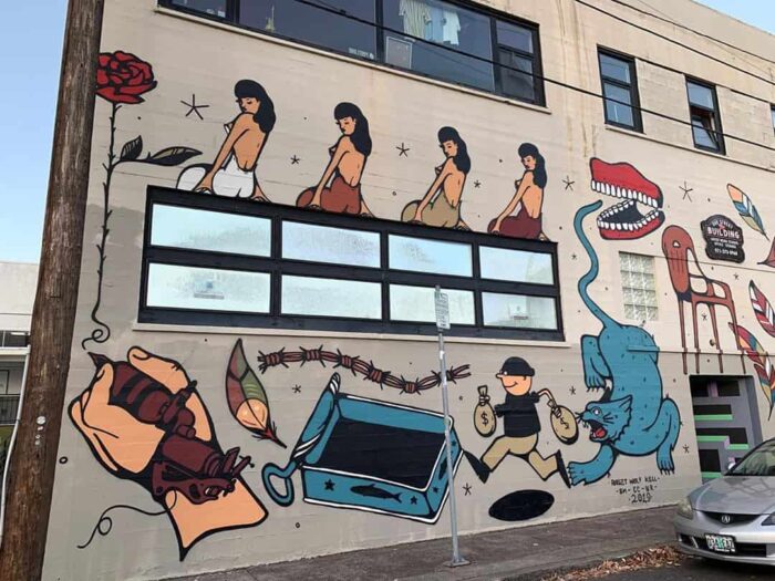 With the extended closure of almost 100 days, several Bishops Portland shops took the opportunity to refresh and remodel their locations. Bishops commissioned Forest Wolf Kell, a muralist, illustrator and designer based in Portland to refresh murals at the Pearl District (pictured above), NW 21st (mural pictured below), and NE 28th locations. Kell’s large-scale work can be seen up and down the west coast and parts of the midwest. His illustrations and murals typically consist of collections of objects, symbols and people constructed into thought provoking compositions.
