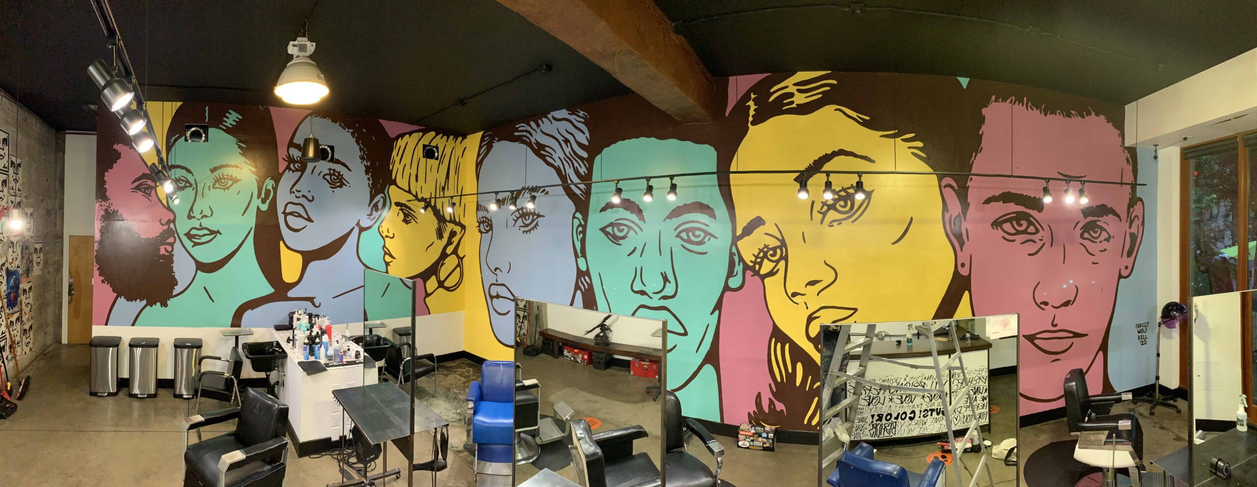 “The recent large scale works that I have been given the opportunity to create for Bishops Barbershop here in Portland has been a refreshing and highly positive experience. I have been on a WFH basis for some time now in my daily design job, which has been a difficult experience for many reasons. My art practice, particularly murals add a lot of balance to my life and provide a much needed outlet. When things began to close as a result of the pandemic I assumed that much of that flow of large scale commissions would dry up, however I have been continually surprised by the multitude of businesses investing in artwork and artists in this period of downtime, despite the uncertainty. I feel incredibly lucky to have had this string of projects with Bishops during this time to maintain that balance and challenging creative outlet. Bishops has been a dream to work with, and give me complete freedom in the design and execution of my artwork in their spaces. And it has been great to contribute to multiple locations around the city I call home. The most recent piece, consisting of the large floor to ceiling faces, I think was particularly impactful to me considering the times, being Pride Month and immense uprising against injustice and discrimination. It felt very pioniont to be painting something that aims to celebrate the beauty of diversity in race and gender in a time like this.”