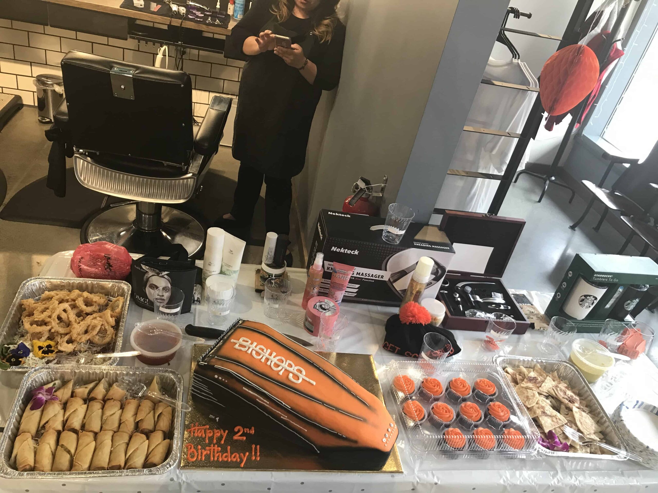 Bishops San Jose Downtown was one of the first locations in the Bay Area and recently celebrated their 2nd anniversary. March 7th saw the shop in full party mode for the occasion. Cakes with Bri made a delicious hair clipper cake for the event along with local Thai food stalwarts SantiThai bringing some of the savory goodness as well.