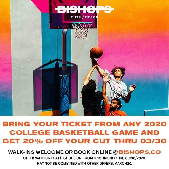 March Madness, the best time of the college basketball season is almost here! Bishops On Broad is getting into the swing of things by offering 20% off your haircut. Just show your ticket from any college basketball game (men’s and women’s) you’ve attended in 2020 through March 30th to receive the discount. While nearby schools Virginia Commonwealth and Virginia Union are probably out of the running for the men’s Big Dance (but are eligible for the College Basketball Invitational and NIT tourneys), University of Richmond is still in the running as a bubble team for the NCAAs. Of course, University of Virginia Men’s Basketball has had a wealth of recent success with the Cavaliers winning the national championship in 2019 and are again in the running for this years NCAA tourney.