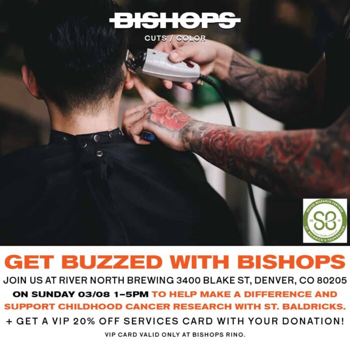 Bishops remains committed to giving back and our friends at Bishops Rino will be doing their part with a fundraiser. Join them on Sunday, March 8 at River North Brewery for an event benefitting St. Baldricks. The non-profit raises funds through events based on donations raised by people willing to go through buzz cuts and head shaves in solidarity with children who typically lose their hair during cancer treatment. Since 2000, St. Baldricks event organizers and volunteers have hosted nearly 4,200 head-shaving events and shaved over 190,500 heads, raising over $118 million for childhood cancer research. All who donate during the event will receive a VIP 20% off services card valid at Bishops Rino, located at 3450 Larimer Street, Denver, CO.