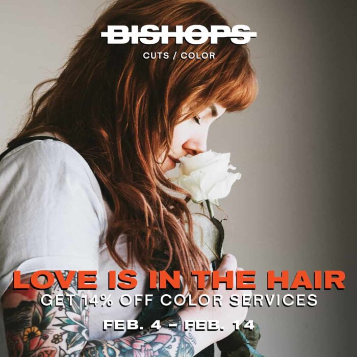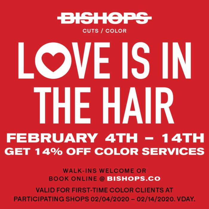 Just in time for Valentine’s Day our annual Love is in the Hair campaign is back! From February 4th through February 14th, participating shops will be offering 14% off color services for all new color clients to Bishops. Whether you’ve never had a color before or just need a refresh we’ve got you. Hair color encompasses so many different styles from a basic 1 process color to Balayage and Ombres and Color Melts. Our stylists engage in ongoing education and training provided by our partners from Wella and Wella Education. Want a vibrant color like green or even rainbow hair? Not a problem as all our shops use the well reknown Pulp Riot color line as well. Feel free to pre-book up to 7 days advance at your closest shop.