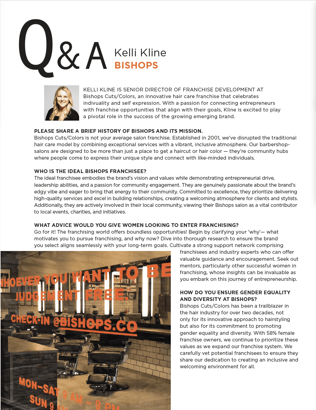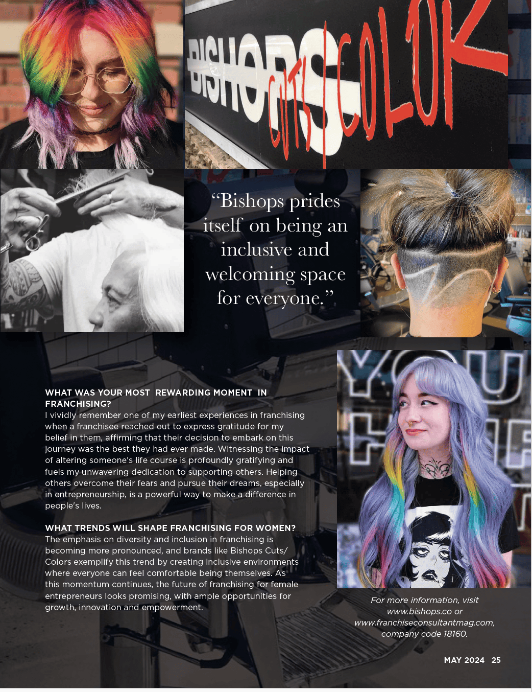 Franchise Consultant Magazine recently connected with our Sr. Director of Franchise Development Kelli Kline for their May 2024 edition. The magazine is a comprehensive resource hub, offering expert advice, market analysis, and industry updates tailored to franchise consultants. The magazine empowers consultants to navigate the intricate landscape of franchising with confidence and precision through its informative content. From articles on franchise trends and best practices to case studies showcasing successful consultancy approaches, each issue delivers actionable insights to enhance consultants’ professional acumen. Whether it’s guidance on franchise selection, legal considerations, or marketing strategies, Franchise Consultant Magazine is a trusted companion, equipping consultants with the knowledge and tools necessary to excel in their roles and effectively serve their clients within the dynamic franchise industry. The original article can be accessed here: https://www.franchiseconsultantmag.com/2024/05/01/qa-kelli-kline-bishops-cuts-color/